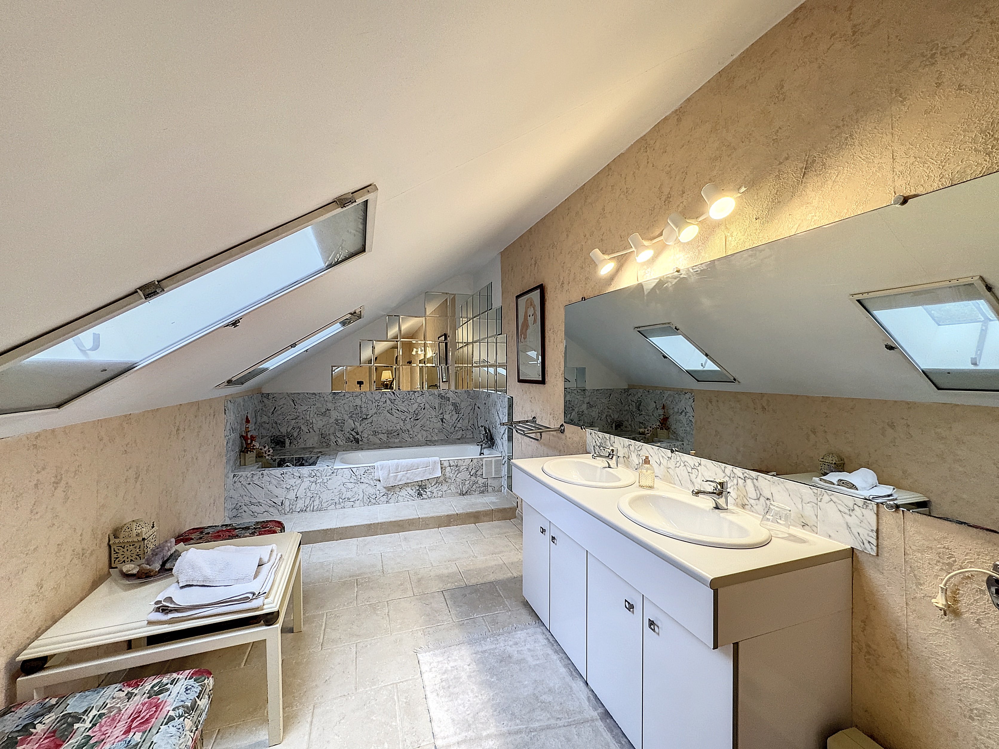 Nous démarrons notre visite par une vaste entrée en marbre qui donne sur un escalier majestueux. Au rez-de-jardin, vous disposerez de quatre pièces de réception, deux chambres, une salle de bain, une cuisine et une lingerie.